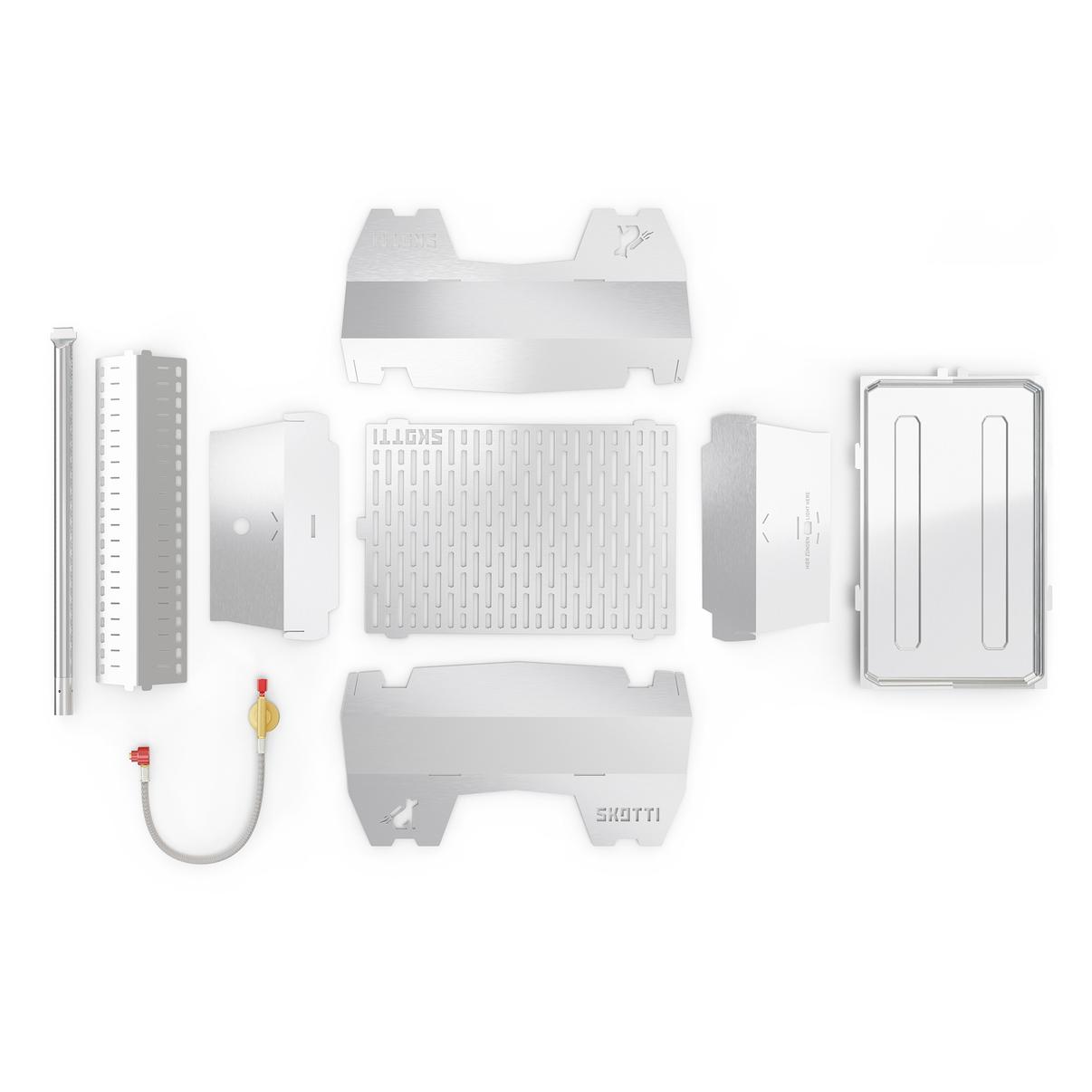 While the SKOTTI Grill shines as a gas grill, it can also be used with charcoal or wood. To switch fuels, just remove the burner pipe and radiation plate, then fill the bottom with dirt or sand, and add charcoal or wood.