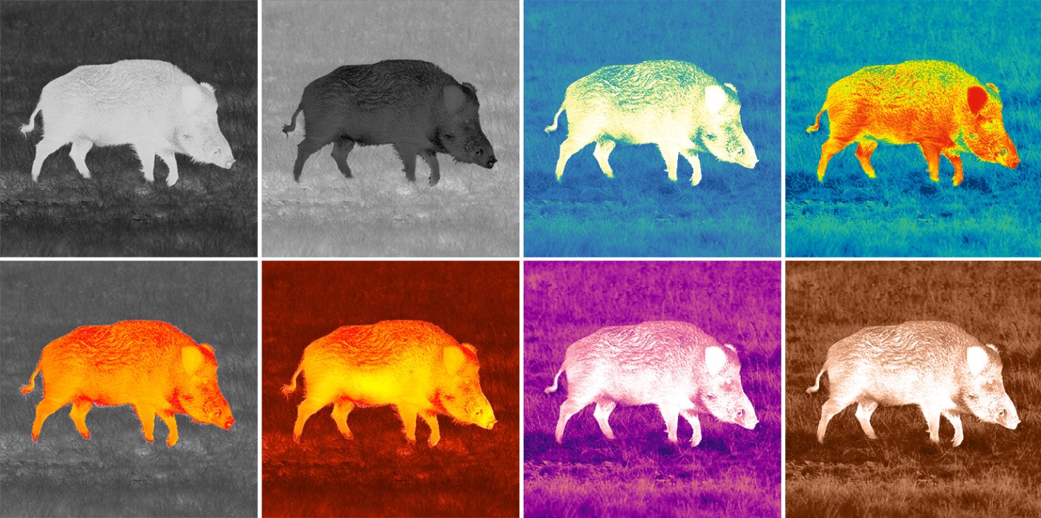 The user can enhance their field of view effectively by choosing from 8 color palettes. This enables them to optimize the unit for specific tasks and adapt to varying observation conditions. White Hot, Black Hot, and Red Hot are ideal for object detection, while Rainbow and Ultramarine improve chances for recognition and identification. Red Monochrome, Sepia, and Violet are best suited for prolonged night observation.